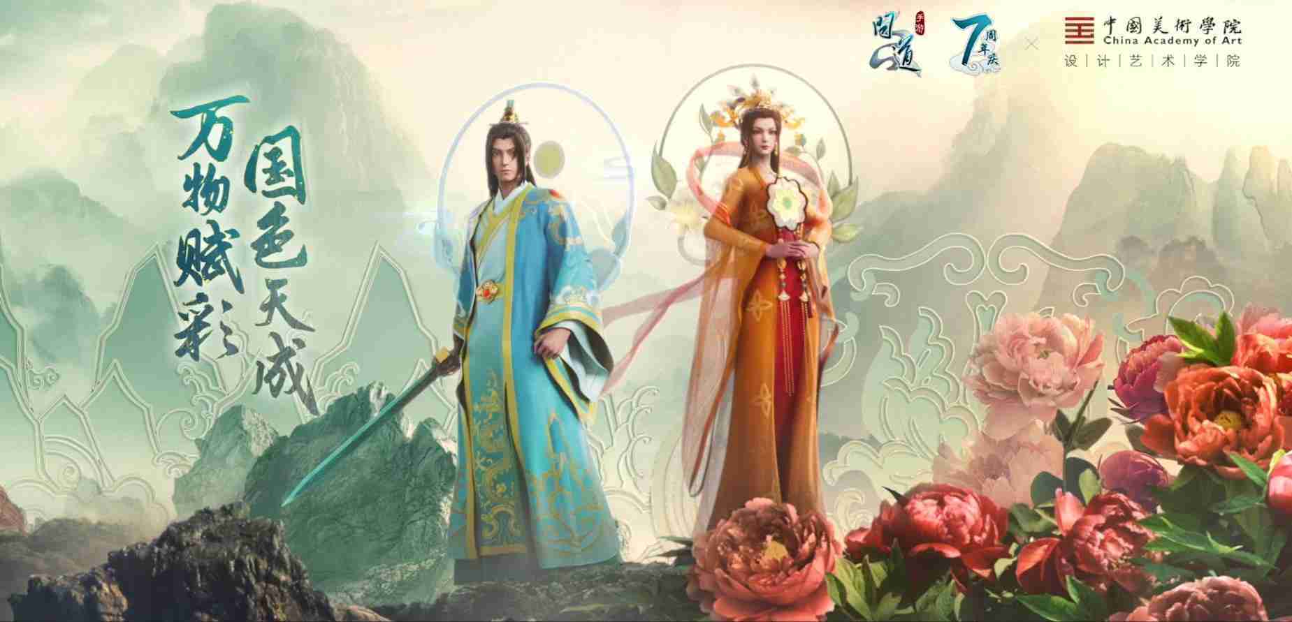 2023年4月,,,《问道手游》联动中国美术学院,,,,在游戏中融合了中国历史上不同时期的文化元素,,,,打造了“山河万象”与“凤鸣九霄”的国风时装。。。。在色彩配置方面,,,创作团队基于对游戏角色特性的分析提取相应的文化内涵,,,,从每一种色彩的色相、、、指代事物和情感出发对应角色属性,,选定服装的色彩搭配。。。在纹样设计方面,,,,创作团队结合游戏角色自身特殊的造型比例和形态,,,在实际的纹样设计中进行了游戏语境下的活化演绎。。男性角色集中使用了如蟒纹、、、海水江崖纹、、、如意纹和云气纹等传统纹样元素,,,女性角色则吸纳了凤凰纹、、、牡丹纹、、卷草缠枝纹等元素,,,组成以“双凤牡丹纹样”“缠枝牡丹纹”“金玉凤冠头饰”为主要纹样的游戏角色装饰图案系统。。。。
